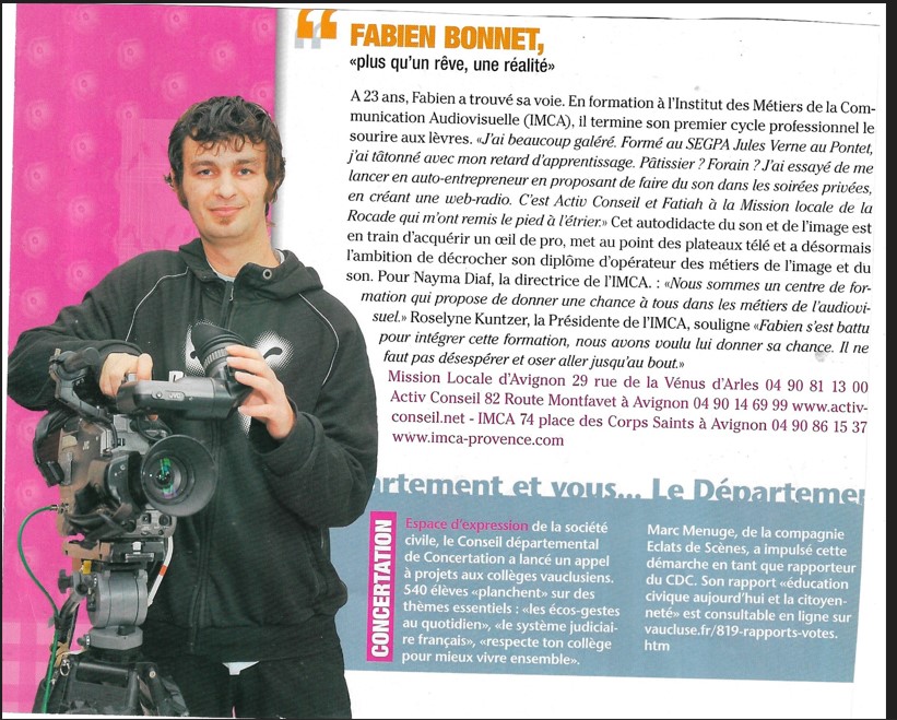 Article réalisé sur moi en 2011 dans Vaucluse Magazine, mettant en lumière mon parcours atypique, mon autodidaxie et mon entrée à l’IMCA Provence.